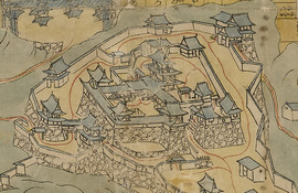 松山城と城下の変遷を、元禄期の松山城下を描いた松山城下図屏風をはじめ、各時期の絵図を通じて紹介します。江戸時代が安定期に入った貞享4(1687)、4代藩主松平定直は二の丸から三の丸に御殿を移して、藩政の中枢とします。藩主の生活の場でもあった三の丸御殿については、近年新しく発見された絵画史料も併せて展示します。また、初代藩主の松平定行は、松山郊外の東野に退き、御殿を建造するとともに茶室を設け、隠居生活を送ります。郊外に現れた別荘についても、近世都市の新たな要素として取り上げます。