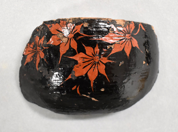 平安時代末ごろから、漆の代わりに柿渋を下地に使う廉価な漆器が作られるようになる。鎌倉時代には、器の表面に草花などを描く漆絵も登場し、その華やかさから漆器の需要を後押しした。当資料は、漆器が普及していく12世紀~13世紀ごろのものと思われる。