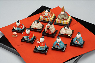 まん丸な頭に引目鉤鼻の独特な表情をもつ次郎左衛門雛は、宝暦年間(1751~64)に京都の人形師雛屋次郎左衛門が作り始めたとされる人形です。大名家や公家の間で長く好まれ、一般的な流行に関わりなく作り続けられました。