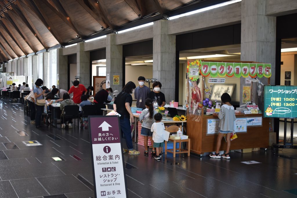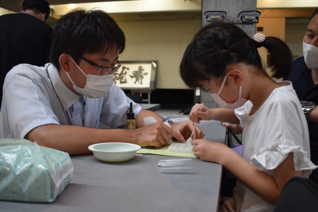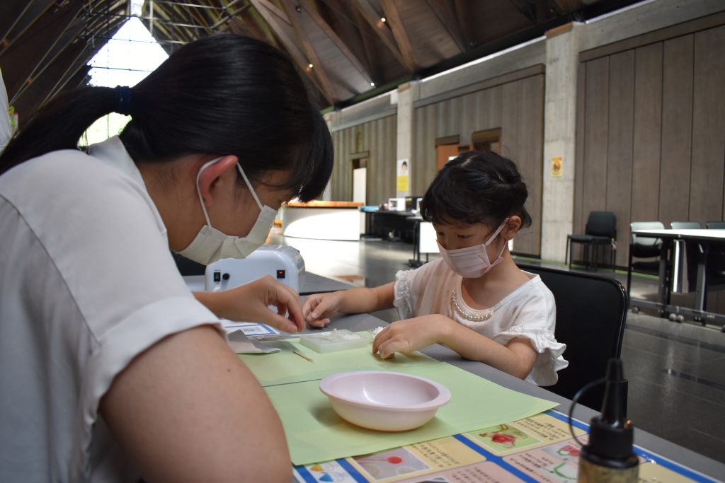 8月23日(火)から始まった5名の博物館実習ですが、最後の2日間は午後からワークショップの補助を行いました。内容は、小さなガラスや砂をレジンで混ぜて紫外線で固め、かき氷のキーホルダーを作るものです。何色にするか、何をのせるかによって、いろいろなかき氷ができます。
