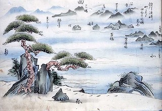 道後温泉を中心に道後の町並が描かれた彩色の絵図。道後温泉は平屋造りで、一の湯、二の湯、三の湯の他にも養生湯や馬湯が丁寧に描かれています。本陣として用いられた明王院をはじめとした旅籠などの建物が街道に沿って並び、周辺には湯神社、湯月八幡宮、宝厳寺などの寺社が詳細に描かれています。山にはすみずみまで手入れされていた様子が描かれています。道後周辺の田園が描かれ、江戸時代における里山と共存していた道後の町の様子が伺えます。