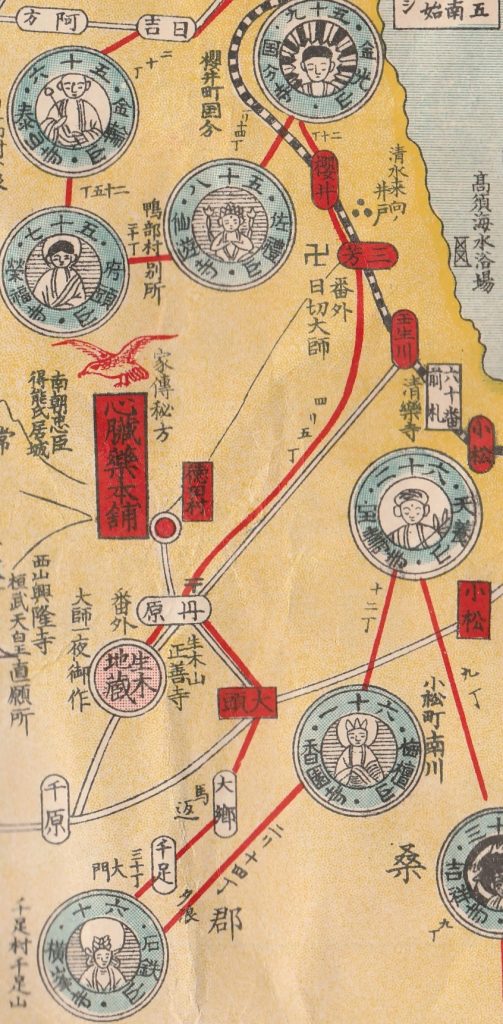 改めて、昭和13年(1938)の「四国遍路道中図」(渡部高太郎版、当館蔵)を確認すると、徒歩による横峰寺道は本図では、五十九番国分寺⇒桜井⇒三芳⇒丹原⇒番外生木山正善寺(生木地蔵)⇒大頭⇒大卿(馬返)⇒千足(夕浪)⇒大門⇒六十番横峰寺の順路となっています(写真②)。