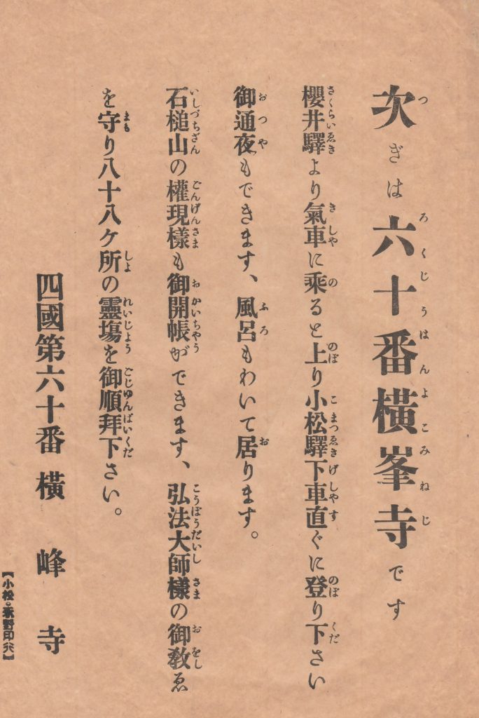 横峰寺へ巡拝するには第59番国分寺参拝後、桜井駅から鉄道(予讃線)を利用して小松駅で下車し、途中の三芳、丹原の区間をショートカットして、小松から徒歩で大頭、大郷、千束を経由して横峰寺へと進む短縮ルートを紹介しています。また、無料で宿泊できる通夜堂とお風呂が利用できることや、蔵王権現の御開帳も可能である点などが宣伝されています。文面からは、山岳霊場で容易に参拝することが難しい横峰寺において、安全且つ安心に遍路が巡拝できるようにと、遍路を誘っている札所側の姿勢が見て取れます。