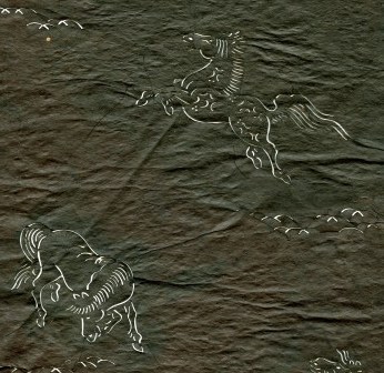 型紙では、尾をなびかせた馬がはつらつと野を駆け回る様子がデザインされています。