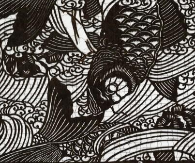 この型紙では、流れに逆らって泳ぐ勇壮な出世魚を、ダイナミックな水の流れと共にデザイン化した、躍動感あふれる文様となっています。