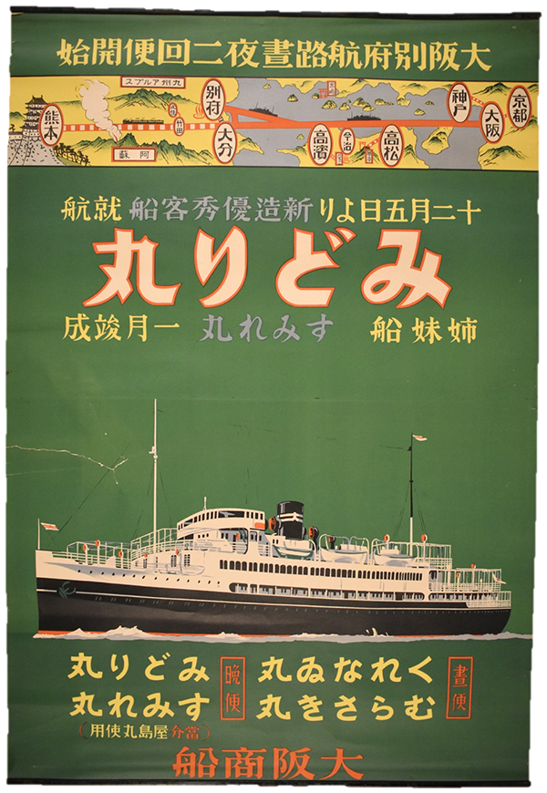 2枚のポスターに共通するのは、観光客の誘致を別府に留まらず熊本まで広げているところだ。みどり丸ポスターの航路図では、大分・別府から熊本(熊本城)までの線路が記され、すみれ丸ポスターには「大阪熊本間船車聯(連)絡一直線」とある。大阪商船が各観光地へ多くの旅行客を送り込んでいたことがうかがえる。