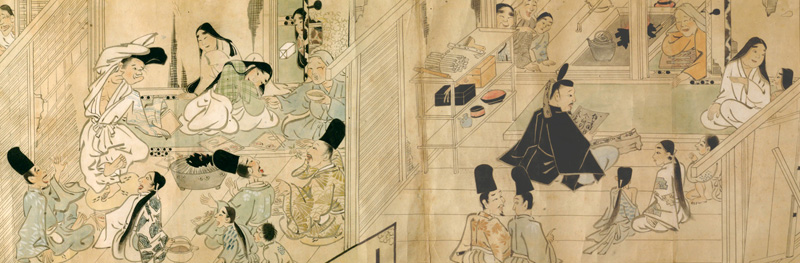 この絵巻、実は愛媛県と関係がある。3段構成のうち第1段では、主人公の絵師が何かを眺めて口元をほころばせ、隣の部屋では大勢が集まり宴を催している。絵師の視線の先には、やや黒っぽい紙に「伊与国得」「令知行」「天気」の文字がのぞく文書がある。床には「参川権守殿 少納言」と書かれた包紙もある。「薄墨の綸旨(りんじ)」といわれる宿紙(しゅくし)を用いて天皇の意を受けて発給される文書で、伊予国得能保(とくのうほう、西条市丹原町)が三河権守(みかわごんのかみ)という絵師に与えられたことが読み取れ、所領を得た喜びが描かれている。