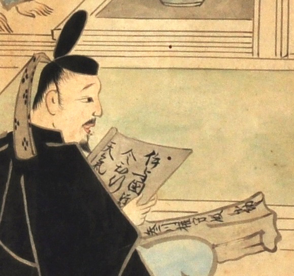 - 「絵師草紙」。拡大図(下)では、手にした綸旨に「伊与国得」などの文字が見える。江戸時代中期、県歴史文化博物館蔵