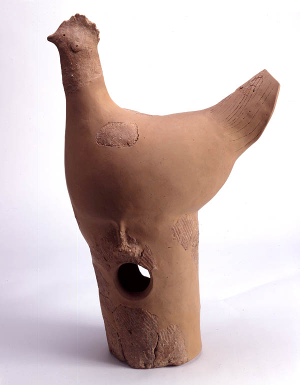 そこで、当館が保管する鶏形埴輪を紹介することで、質問に回答したい。本資料は今治市の高橋仏師1号墳(全長約21mの前方後円墳)の発掘調査で出土したもので、頭部と羽、基底部が残存していたが、調査者の研究でほぼ完形に復元されている。頭部のとさかの形から、おんどりである可能性が指摘されている。よく観察すると足先も線刻で表現されている。県内ではこのような鶏をかたどった埴輪は4例のみしか出土しておらず、非常に珍しい資料である。