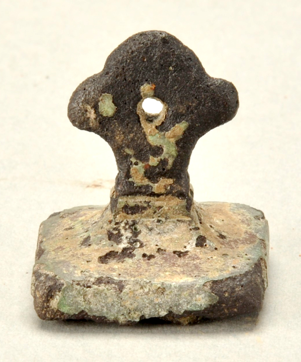 - 今治市別名端谷Ⅰ遺跡出土の銅印(縦3.0cm、横3.0cm、高さ3.7cm)。奈良―平安時代(8~9世紀)。下は印面。県歴史文化博物館保管。
