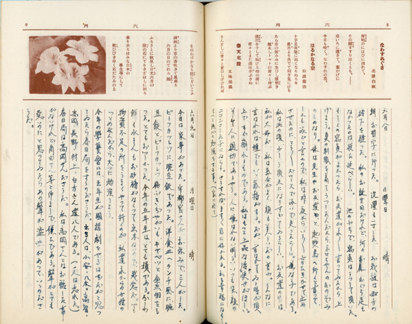 6月、「家事」の授業で洋食皿にエンドウ飯、ビーフカツレツ、粉ふきじゃがいもなどを盛ったが、「今年の5年生はとても損である。かしわ餅も水まんもお砂糖がなくて出来ないので残念だ」と記している。