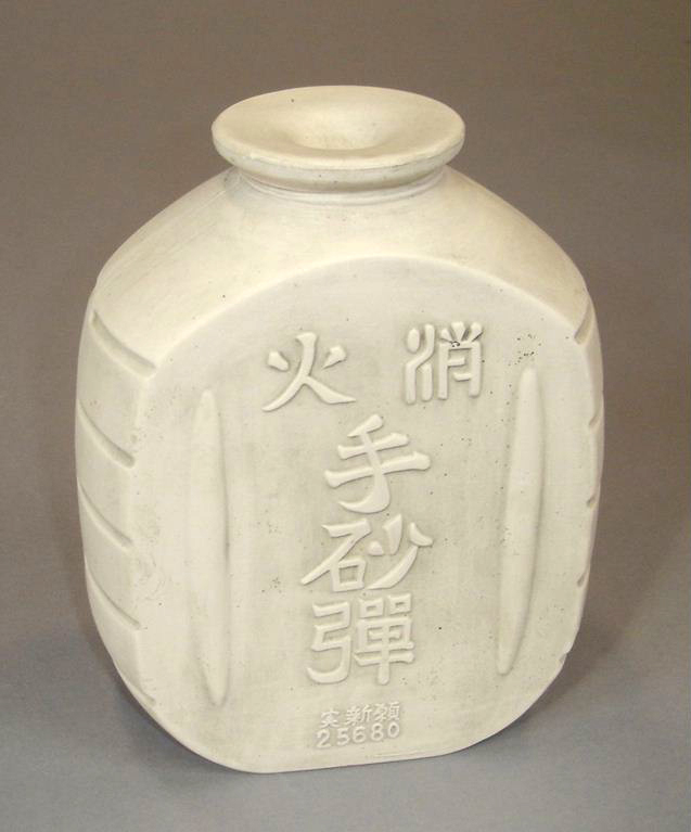「消火手砂弾」と言っても大砲や鉄砲の「弾」ではない。砂が入った陶器製の消火剤である。空襲の際、陶器ごと火の中に投げ入れ、陶器が割れて中の砂が飛散することにより、消火しようとしたものである。本資料は大洲市の方から寄贈された。大洲は空襲をまぬがれたため、使用されなかったのだろう。現在も陶器の中にはわずかながら砂が残っている。