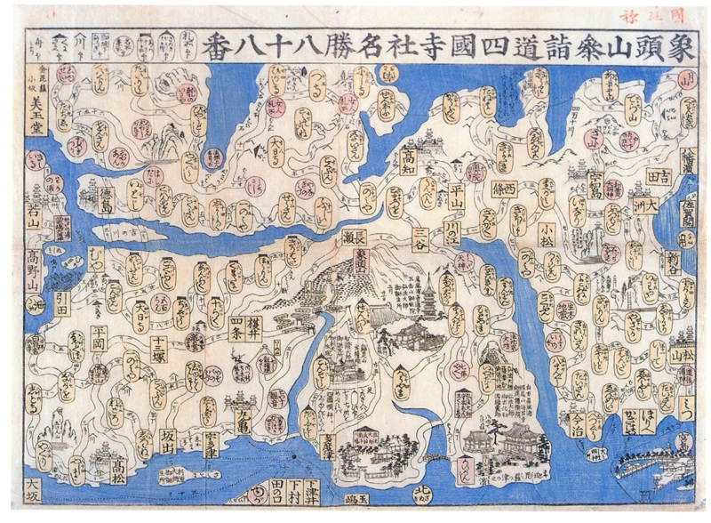 当時、金毘羅参詣とあわせて四国遍路を行う旅人も多く、こうした絵図が土産として買い求められたものと考えられる。