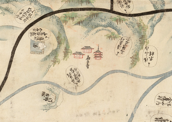 絵図には興味深い描写がいろいろとあるが、一番おもしろいと思ったのは道後付近である。道後村と記された小判形の村形の下に「湯」とあるのが道後温泉で、その横には石造の湯釜が描かれている。名所の描写について統一基準はなく、絵図を作製した国元の判断に委ねられたものと思われるが、絵師が道後温泉を象徴するものとして湯釜を描き込んだのだろう。簡潔でありつつも、道後温泉を示す秀逸なランドマークといえる。