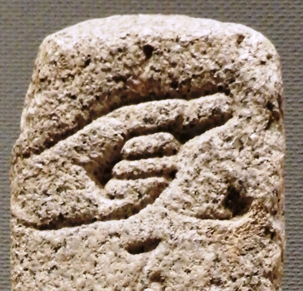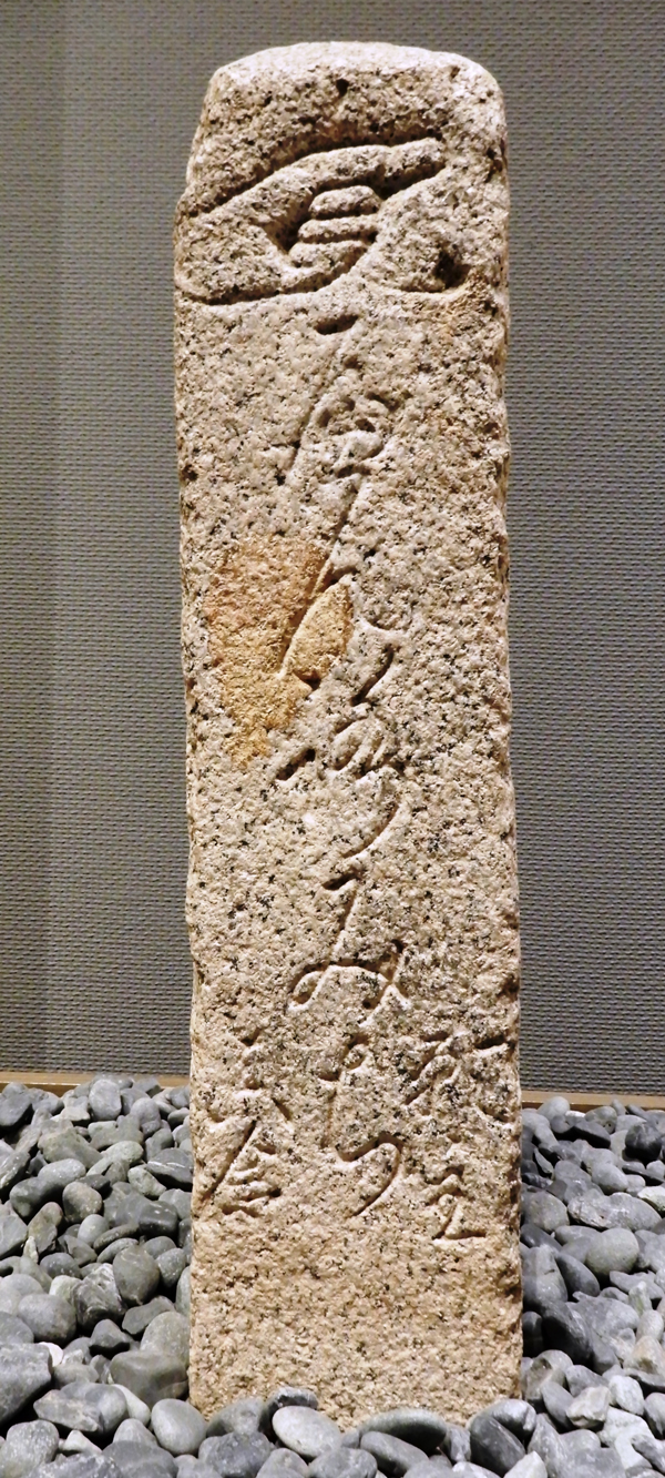 - 真念の遍路道標石(下は拡大図)」。「左」の文字が指印に改刻されている =県歴史文化博物館蔵