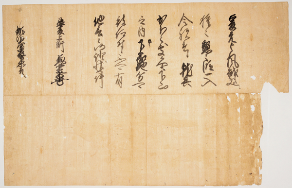 上質な雁皮紙(がんぴし)を使っており、不遇の時代にも、摂関家一条家としての誇りがうかがえる。また、本拠幡多郡で具体的な所領を約束する姿は、いずれ再起を果たそうという兼定の意志の表れのようでもある。本文中の「他言あるべからず」との文言も興味深く、単に特別扱いの意味だけではなく、結束の密約の様相をもにおわせる。兼定が土佐を離れた後も、南予に支援勢力が存在したことを物語っている。しかし、兼定のその後を知る現代の目線からすると、この約束が空手形に終わったことは想像に難くない。