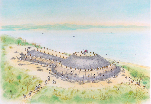本連載にて何度か紹介したことがある県内最大の前方後円墳・今治市相の谷1号墳(全長約82m)の完成間近の様子を描いた復元画。眼前には来島海峡としまなみの島々が広がる。古墳の造営には多くの人々の労働が必要であった。古墳の上では、この古墳を造らせたリーダーが沖を行き交う船を見つめている。古墳に並べられた埴輪(はにわ)には、東四国の影響を受けたものもあり、近隣地域とのネットワークもあったと思われる。