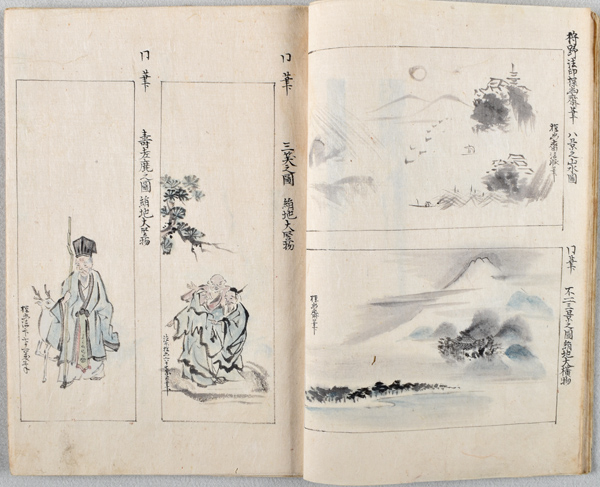 - 大洲藩主加藤家所蔵絵画の縮図。右下の絵は、狩野探幽が描いた富士図(県歴史文化博物館蔵)