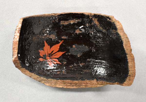 平安時代末ごろから、漆の代わりに柿渋を下地に使う廉価な漆器が作られるようになる。鎌倉時代には、器の表面に草花などを描く漆絵も登場し、その華やかさから漆器の需要を後押しした。当資料は、漆器が普及していく12世紀~13世紀ごろのものと思われる。