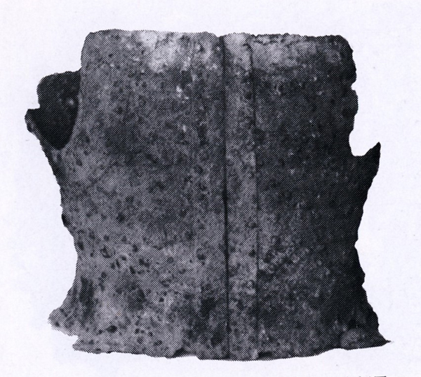 - (上)短甲(古墳時代中期)=残存高31.0cm、県歴史文化博物館保管(下)出土後の写真=「愛媛県史 原始・古代Ⅰ」(1982年)より